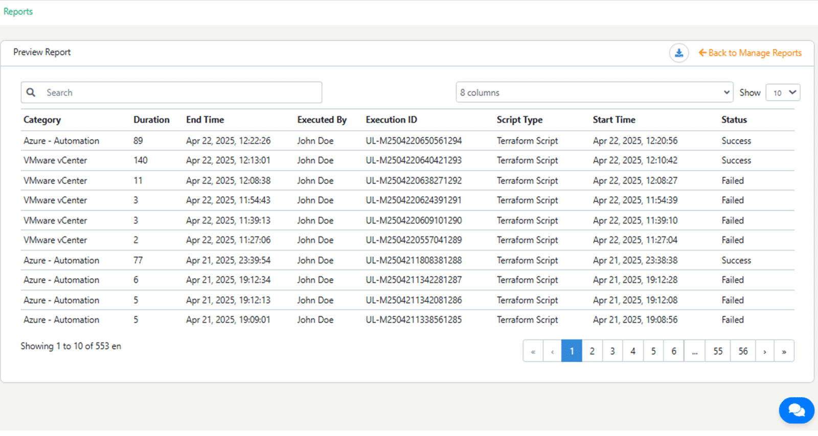 • Easily simulate workflows from our intuitive dashboard, select your preferred automation scripts, set execution times, and view execution summaries by category, status, execution ID etc.